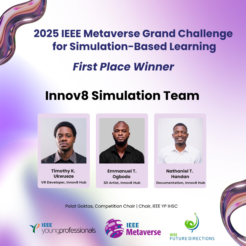 In another remarkable stride toward innovation excellence, the Innov8 Hub Simulation Team has emerged as the First Place Winner of the prestigious 2025 IEEE Metaverse Grand Challenge for Simulation-Based Learning, an international competition recognizing the most creative and impactful uses of simulation and metaverse technologies in education and training.